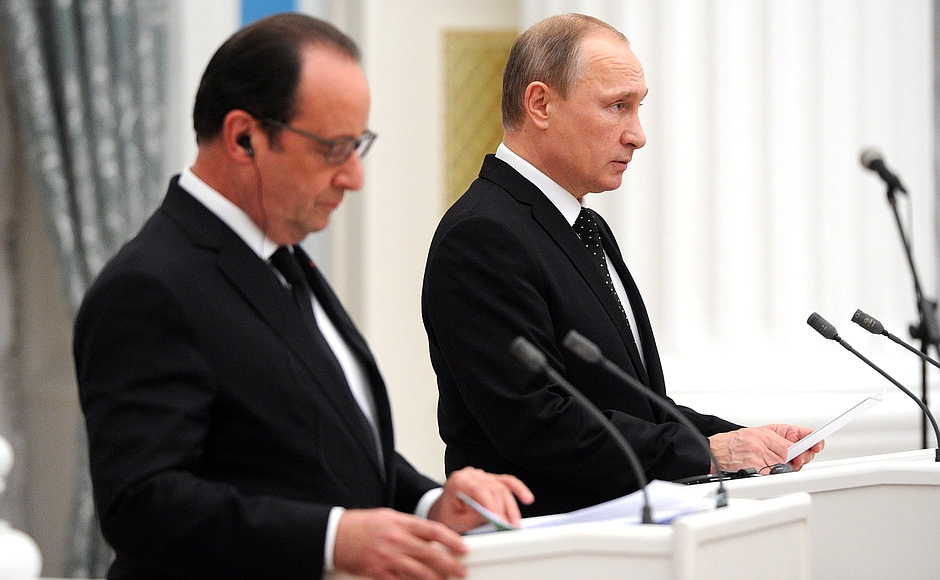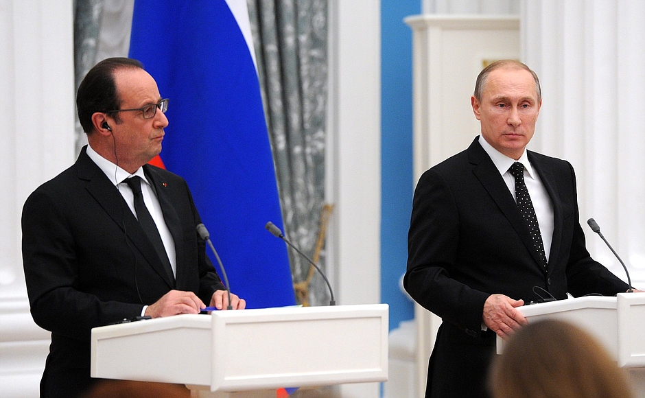 La Russie et la France savent ce que signifie l’action dans un esprit d’alliance ; nous nous sommes unis plusieurs fois tout au long de notre histoire. Aujourd’hui, nous sommes convenus d’intensifier nos efforts communs pour la lutte antiterroriste, d’améliorer l’échange d’informations opérationnelles dans la lutte contre le terrorisme et d’établir un travail constructif entre nos experts militaires afin d’éviter tout incident, concentrant nos efforts afin de s’assurer que notre travail dans la lutte contre le terrorisme soit plus efficace, et évitant les frappes contre les territoires et les forces armées qui combattent elles-mêmes les terroristes.