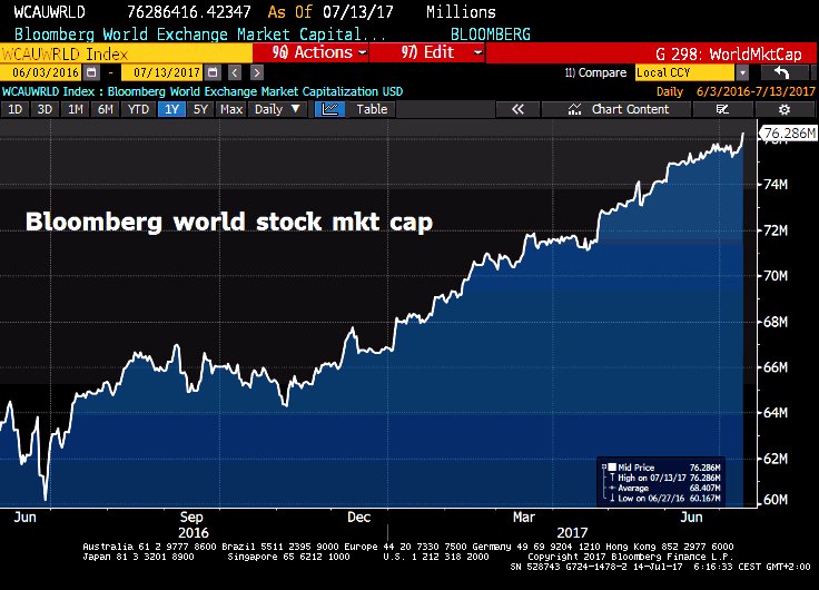 Avec les récentes performances, voici un nouveau record pour le marché mondial des actions: une capitalisation boursière de 76,3 trillions. Une hausse de 1,55 trillions cette semaine!