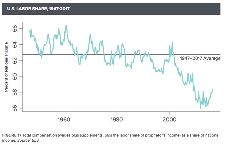 Un graphique interessant; la baisse continue de la part des revenus salariaux totaux dans le revenu total américain.