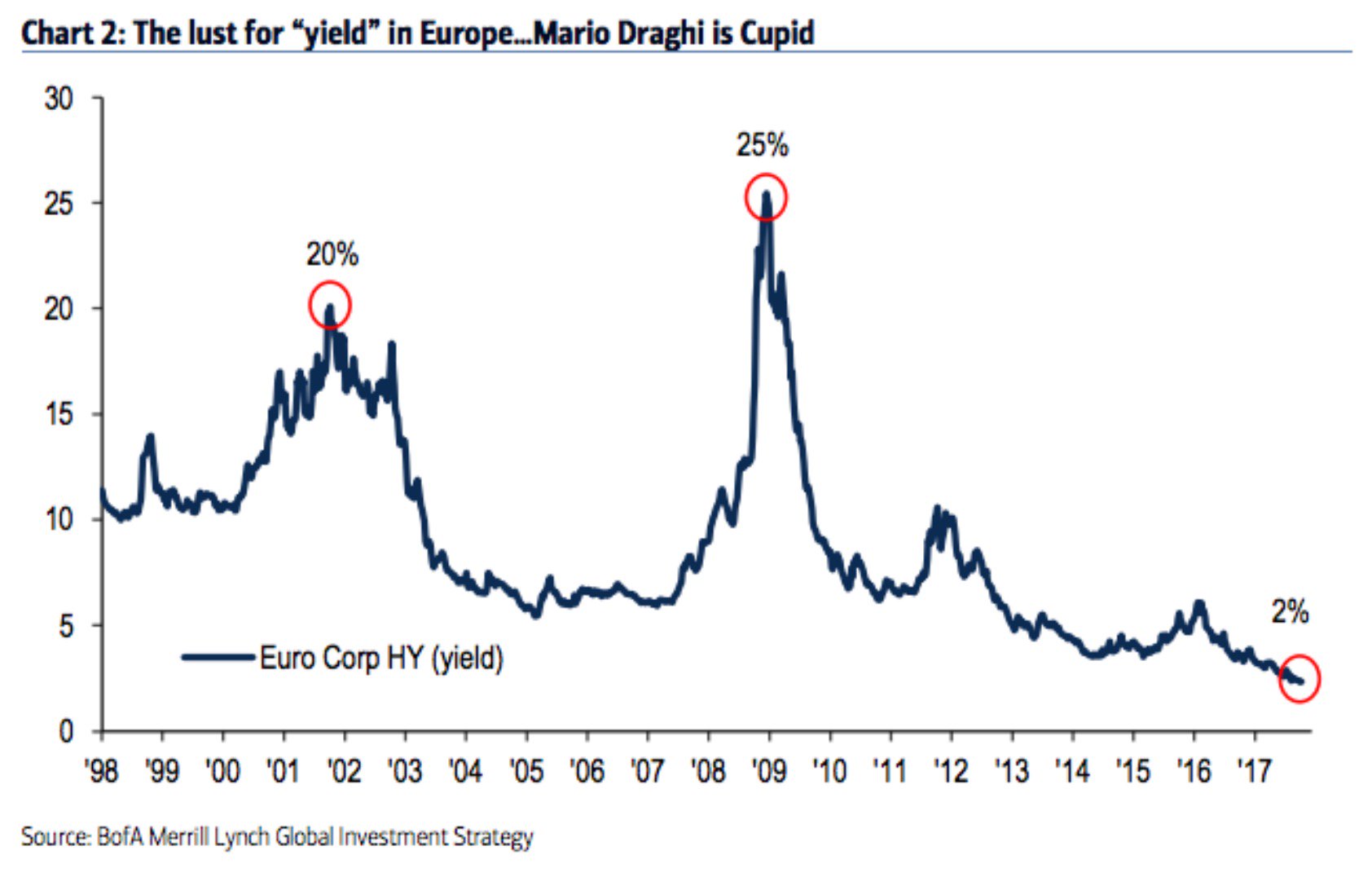 Les emprunts à haut risque européens rapportent moins que les Treasuries, les emprunts du gouvernement américain! C’est une conséquence de la politique absurde de Draghi qui a tout détraqué. Ce rendement de 2% est encore plus idiots que le rendement négatif des fonds d’état. Les Treasuries américains rapportent 2,30% tandis que les emprunts à haut risque européens, rapportent 2%.