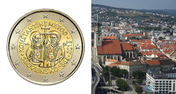 La Commission européenne a ordonné à la Slovaquie de revoir le design de ses pièces commémoratives et d’éliminer les saints chrétiens Cyrille et Méthonius. (Sources des images: Pièce – Commission européenne, Bratislava, Slovaquie – Frettie / Wikimedia Commons)