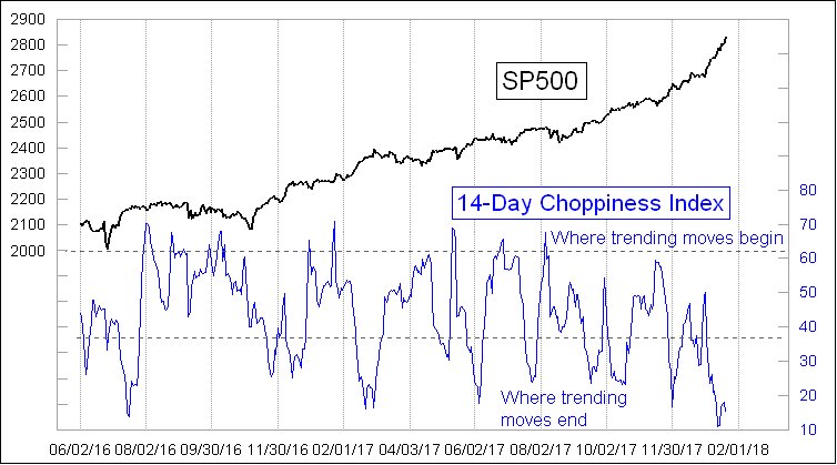 L’indice ci dessous, le Choppiness Index mesure en quelque sorte l’inverse, c’est à dire le caractère choppy, heurté du marché.