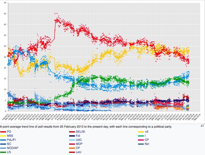 Le futur chaos italien , ci dessous l’évolution des différents partis italiens dans les sondages : le Mouvement 5 Etoiles en tête depuis … 62 sondages!
