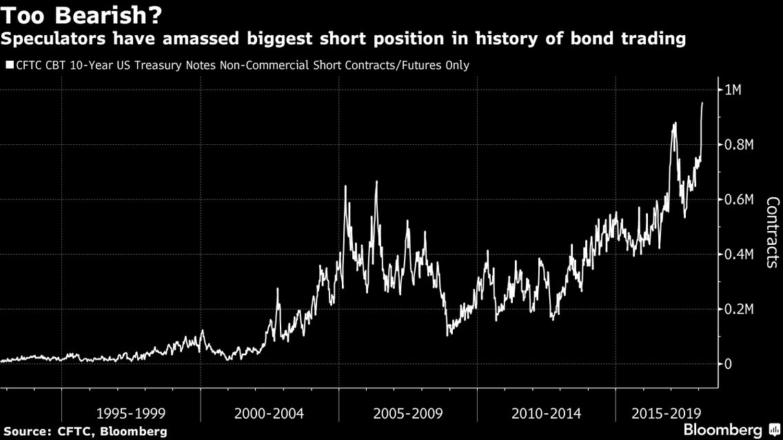 Tous du même coté du bateau ! La communauté spéculative a amassé une position vendeur à découvert, short, sur les treasuries 10 ans US . C’est un record historique, comme d’ailleurs tout ce qui concerne la finance depuis 2007; tout est et sera historique, y compris l’issue !