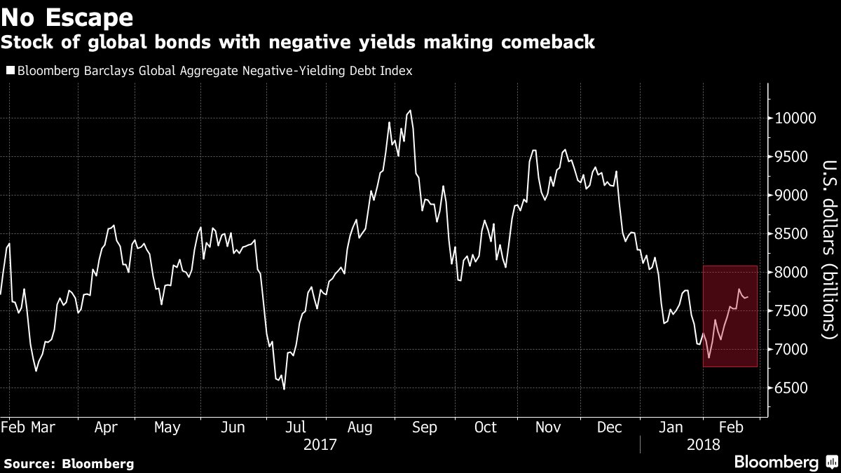 Pour ceux qui croient que la crise c’est fini et que tout est rentré dans l’ordre, voici de quoi les faire reflêchir: la masse de bonds qui benéficient d’un taux de rendement négatif, donc la masse de bonds ou l’investisseur paie pour les posséder, cette masse reste colossale et surtout, elle a tendance à remonter! Entre 7,5 et 8 trillions de dollars.
