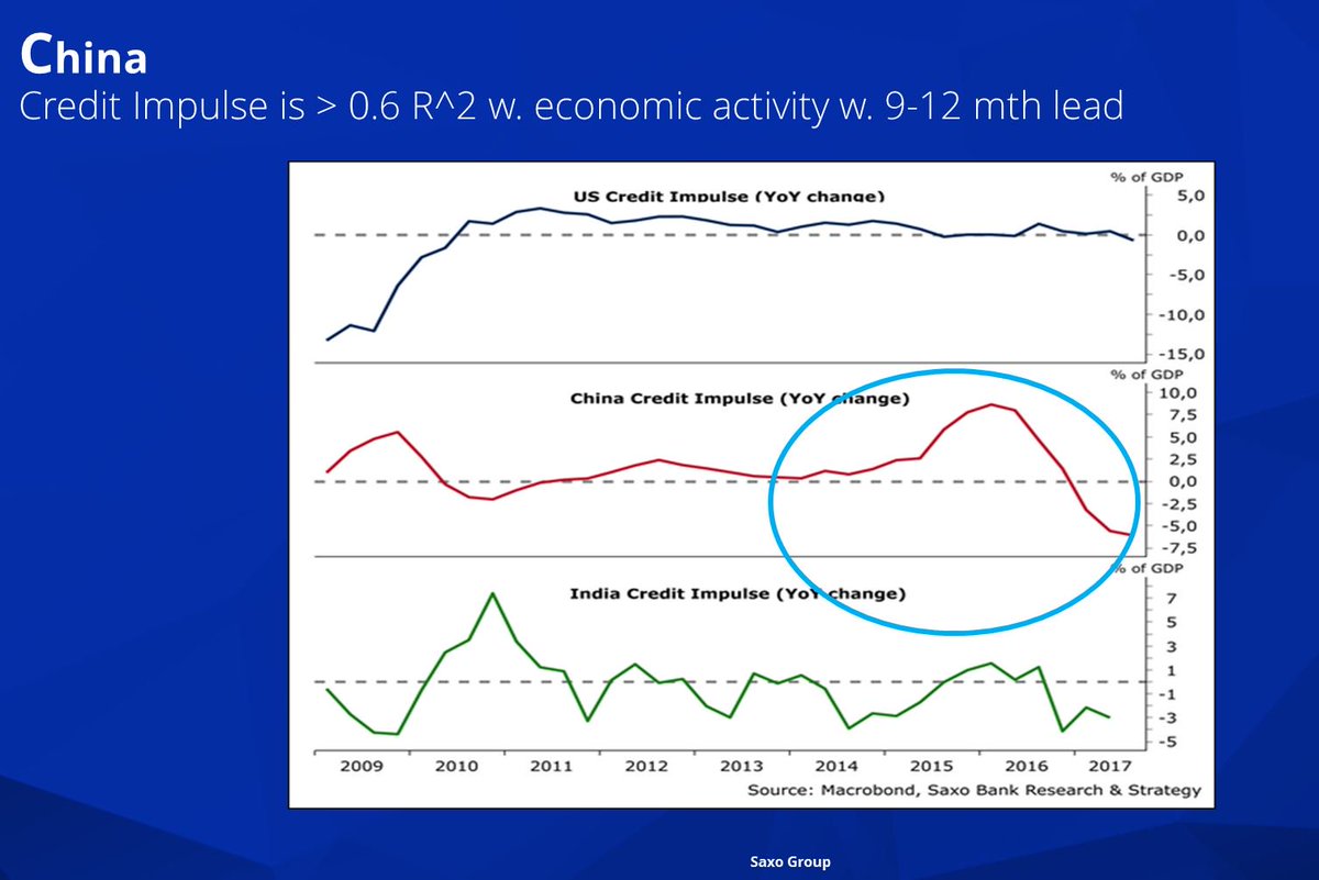Le credit impulse chinois continue de chuter, tandis que le credit impulse américain s’érode. Conclusion logique on va vers un ralentissement de la fameuse croissance globale synchronisée avec un décalage danbs le temps bien sur.