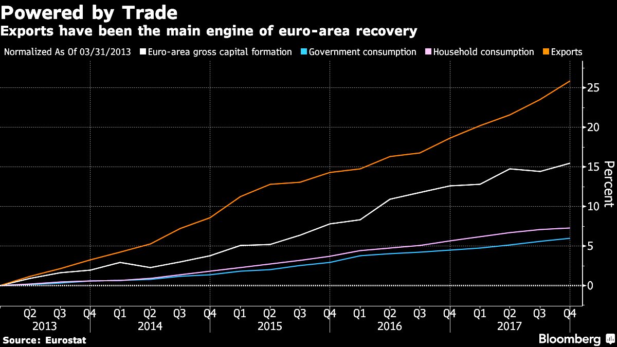 Les exportations ont été le moteur de l’embellie économique européenne, d’ou un gros problème avec la Trade War directe et la Trade War indirecte, la hausse du change