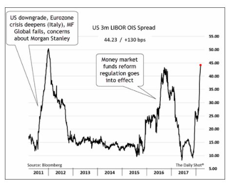 Voila qui ne fait pas les affaires de la Deutsche Bank (entre autres) ! Dollar-funding serré…pour les banques non US. Comment interpreter? A suivre.