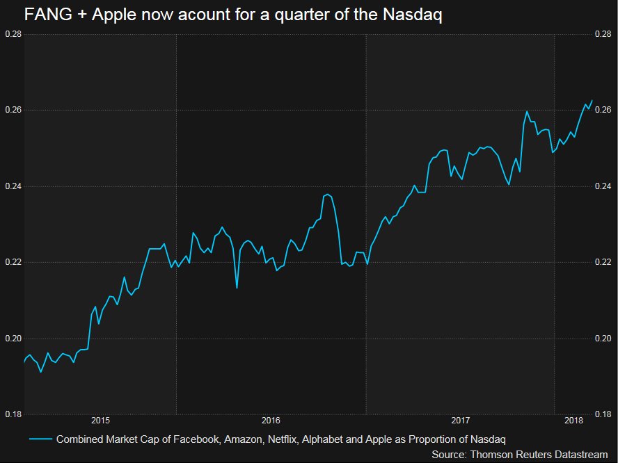 Incontestablement le charme qui enveloppait les opérateurs est en train de se briser. Même la Lorelei des Fang du Nasdaq est décoiffée, elle ne parvient plus à séduire. Les Fang plus Apple représentent près du quart du Nasdaq si je ne me trompe pas. C’est gros c’est lourd et surtout c’est concentré et donc fragile. Le sous jacent des Fang est le même pour tous, c’est non pas la valeur et les résultats, encore moins les dividendes , mais le rêve, l’espoir et l’illusion. Le tout affublé de la baguette magique de la disruption!