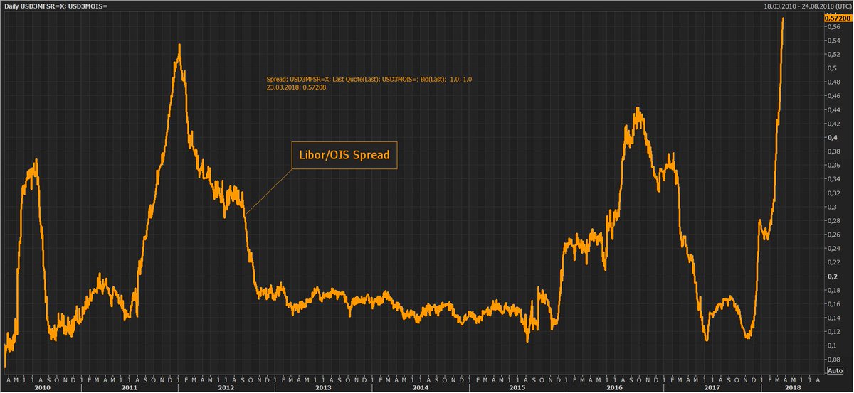Le motif d’inquiétude systémique: le spread Libor /OIS , il fait craindre des tensions sur le dollar funding des TBTF globales type Deutsche Bank, comme ce fut le cas fin 2015 et début 2016 .