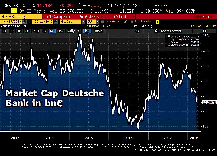 La Deutsche Bank ne pèse plus que 23 milliards, sa capitalisation a engouffré les 8 milliards qu’elle avait demandé à ses actionnaires en 2017, on est rendu au même point qu’avant l’augmentation de capital.