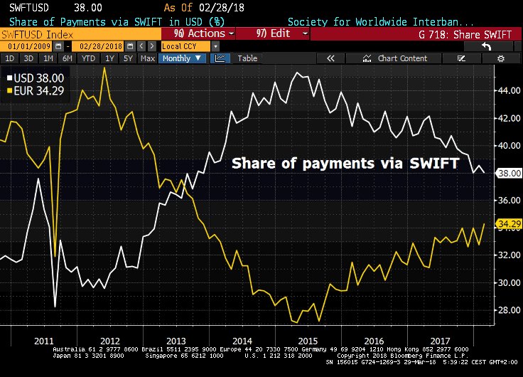 Erosion continue du dollar, hausse continue de la part de l’euro dans le trafic des paiements SWIFT. Ce qui compte ce n’est pas l’attrait de la monnaie mais l’attrait de la juridiction euro !