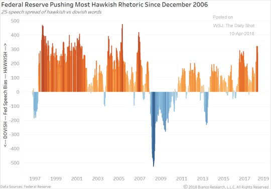 Ici les apprentis sorciers mesurent l’apparition des mots qui pointent vers dovishness ou hawkishness et en tirent la conclusion, que nous connaissions déja bien sur, que la Fed, qui est en phase de resserrement, est plus hawkish!