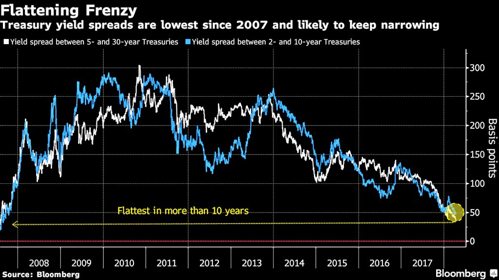 Les spreads comme on dit sont minuscules, il ne cessent de se contracter. On appelle cela l’aplatissement la courbe des taux, et cela traduit le fait que les écarts entre les échéances courtes et les échéances longues ou très longues sont historiquement faibles, insuffisants. Le 10 ans US, le phare mondial n’arrive pas ou plus à dépasser les 3%.