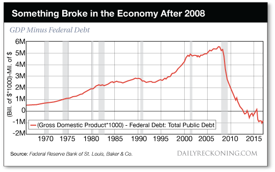 Un système qui ne tient que par l’accroissement des dettes: ici le GDP moins la dette fédérale US
