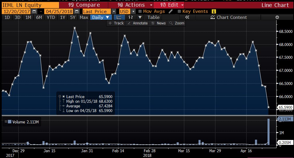Les problèmes sur les dettes des émergents se précisent comme nous l’avons évoqué ces derneirs jours: ci dessous un graphique qui retrace la valeur d’un ETF spécialisé dasn les dettes des émergents en monnaie locale. Il est au plus bas de l’année, victime de la hausse du dollar.