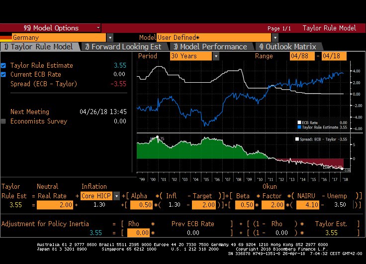 C’est jour de BCE, selon la Taylor Rule adaptée à l’UE, le taux directeur devrait être à 3,55% compte tenu de la situation conjoncturelle européenne, or le taux est à 0%!