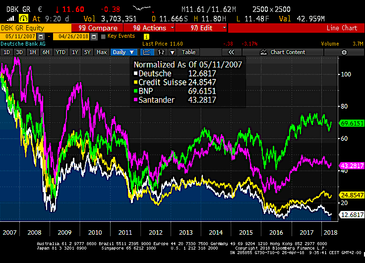 Il n’y a pas que les banques italiennes qui sont malades et sous perfusion indirecte, il y également la Deutsche Bank. Elle glisse, elle glisse; à elle seule elle est le reflet de toutes les contradictions du système allemand , lequel se caractérise par une insertion globale mais une volonté de specificité et d’orthodoxie qui sont incompatibles avec ce choix. D’une pichenette, la Fed et les anglo saxons peuvent declencher une crise sur la DB et mettre l’Allemagne à genoux, bizarre, personne n’évoque le sujet! Pas plus que l’on ose évoquer l’incroyable situation de Target 2.