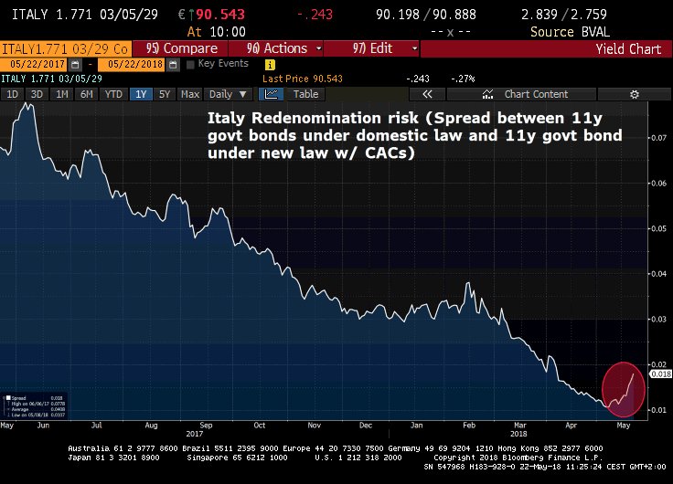 Les financiers mesurent le risque de « redénomination » par l’écart de rendement entre les bonds soumis à la loi domestique italienne et les bonds qui sont soumis à la nouvelle loi. C’est une mesure utilisée en finance ne nous demandez pas si elle est adequate, nous ne le savons aps. Vous savez que la finance transforme tout en en chiffres.