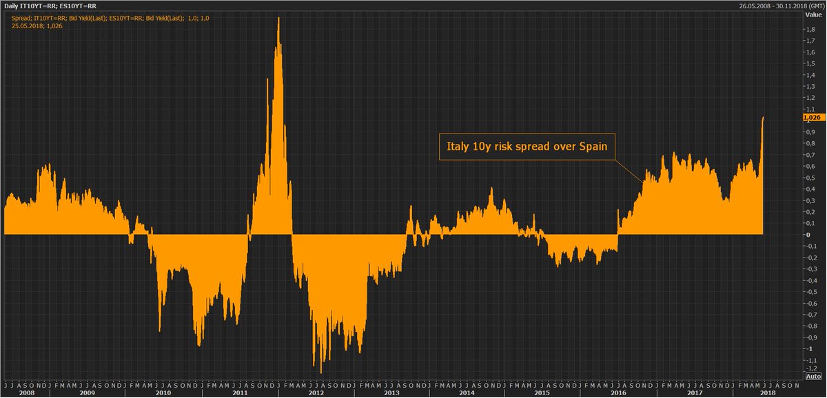 La prime de risque sur les bonds italiens, les BTP, sur les bonds correspondant espagnols atteint les 100 pbs. Pas vu depuis 2012!