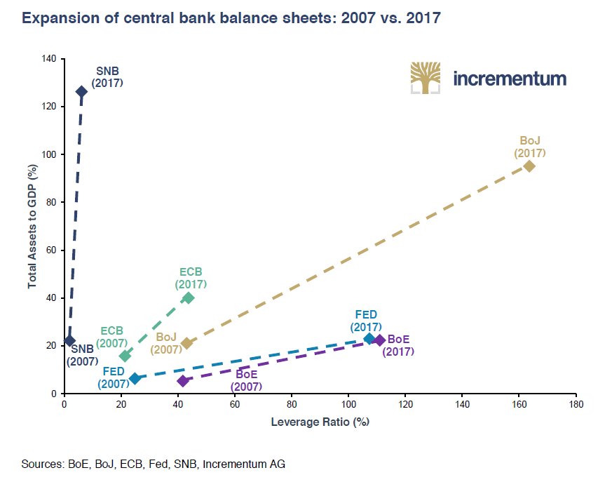 *Pensez y quand un politicien dit: la situation fondamentale est bonne! Les ratios des actifs des bilans des banques centrales par rapport aux GDP ont explosé; le record c’est la Banque Nationale Suisse, mais la BCE n’est pas mal non plus.