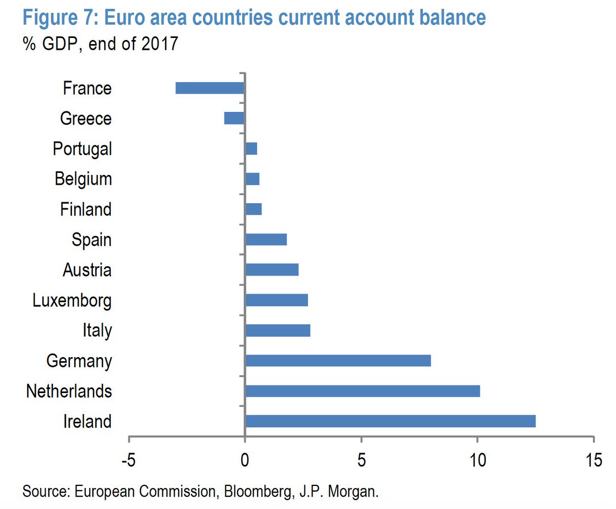 #Italy has been running current account surplus since Euro crisis in 2012. This current account surplus makes it easier for Italy to exit the euro relative to a current account deficit country as current account deficit would have to be closed abruptly following exit, JPM says