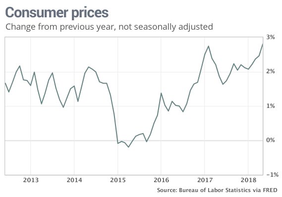 Les prix ont poursuivi leur progression aux Etats-Unis en mai faisant grimper l’inflation annuelle à 2,8% sur un an, au plus haut depuis 2012, selon l’indice des prix à la consommation publié mardi par le département du Travail.