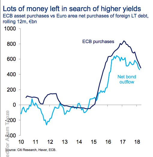 Regardez la corrélation entre le volume des achats de la BCE et le volume d ‘achat de dettes étrangères, c’est comme si le pipe line était branché en direct.