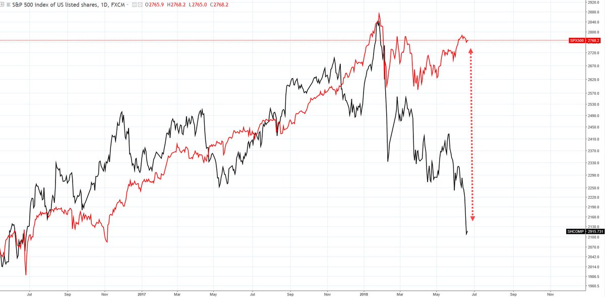 Cette juxtaposition est difficile à intepreter. La corrélation entre le S&P 500 et le marché chinois de Shanghai est évidente , mais depuis le début Janvier 2018 quelque chose a changé. Le résultat est une divergence car le marché chinois est bien plus lourd.