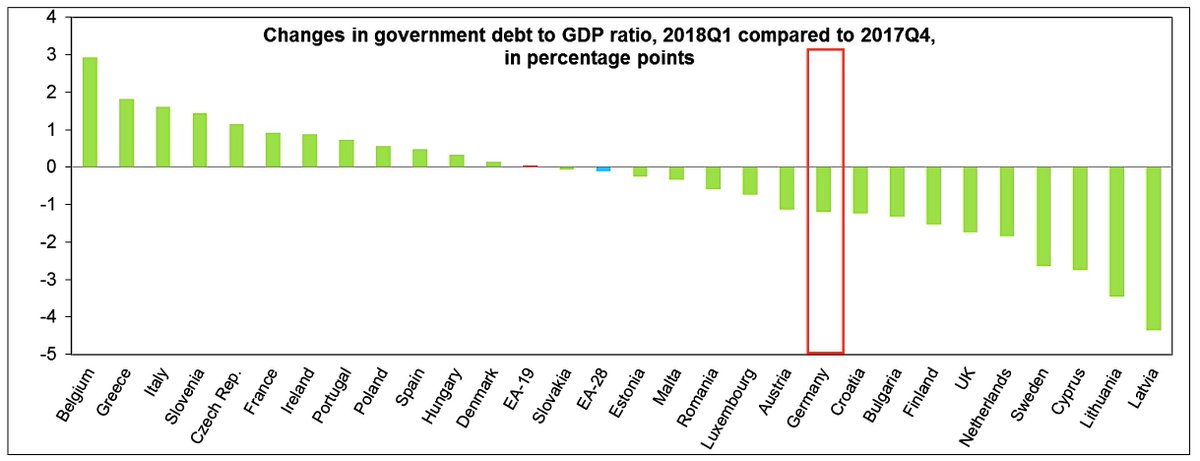 le ratio de dettes en Allemagne continue de chuter à 62,9% . En Belgique, Italie, France etc il continue de monter. Le ratio européen n’est guère élevé à 86,8% du GDP.