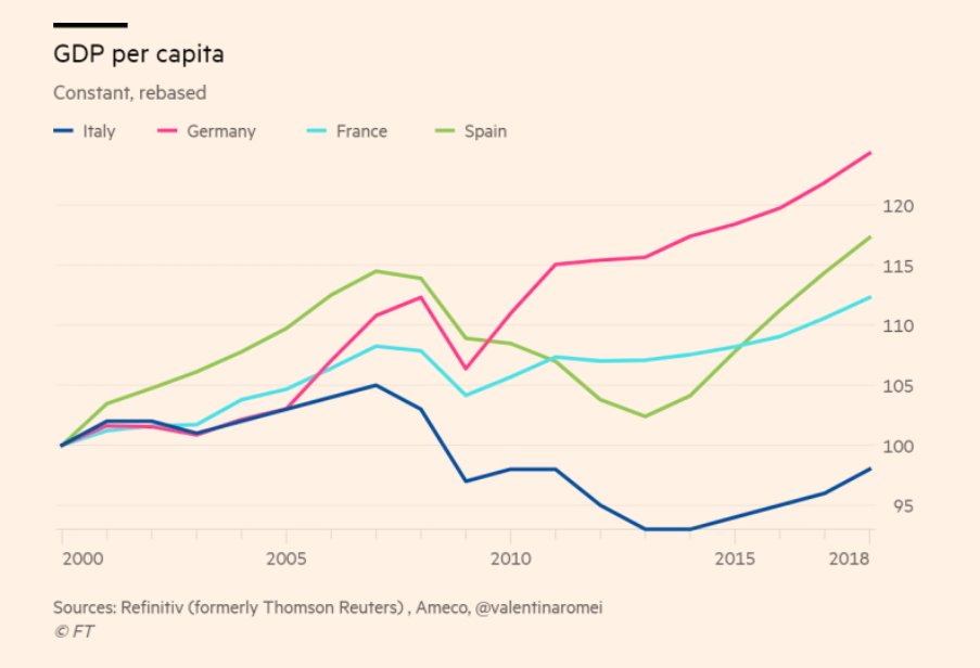 En Italie le PNB par habitant est en 2018 inférieur à ce qu’il était en 2000 et les Allemands voudraient que la politique économique reste austéritaire: « les règles sont faites pour être respectées répète le perroquet Moscovici ».