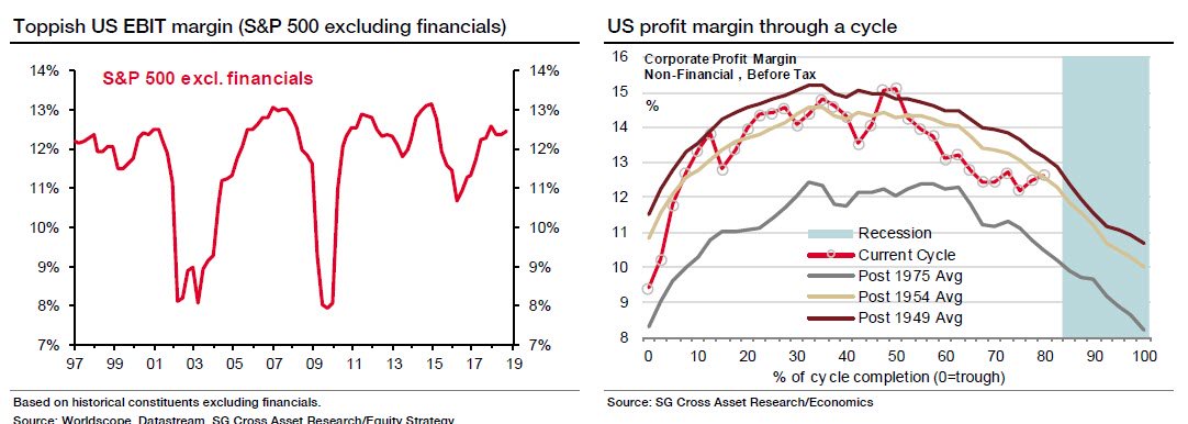 En termes de comptabilité nationale, la profitabilité du capital US a clairemnt recommencé à baisser, mais il n’y a pas que la profitabilité, les marges bénéficiaires également sont en érosion. Et cela va s’accentuer avec la hausse des coûts salariaux et des coûts financiers. Par ailleurs les astuces comptables et les buy backs vont avoir plus de difficulté à dissimuler la situation. Le reporting, les bénéfices déclarés vont décevoir.