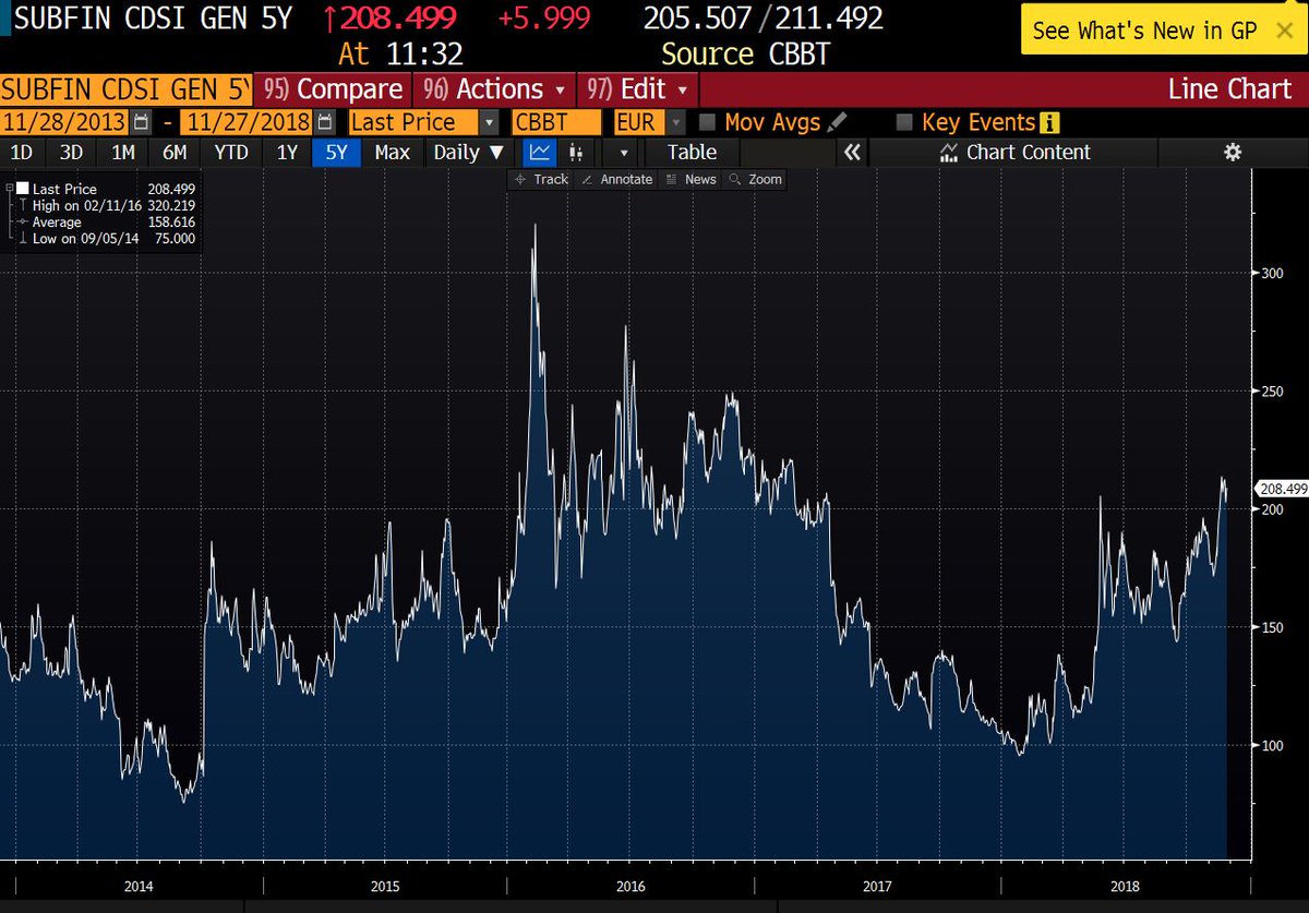L’inquiétude monte sur les banques euros. Regardez les CDS, assurances contre les problèmes des banques européennes sur leurs dettes subordonnées , elles sont en net renchérissement .