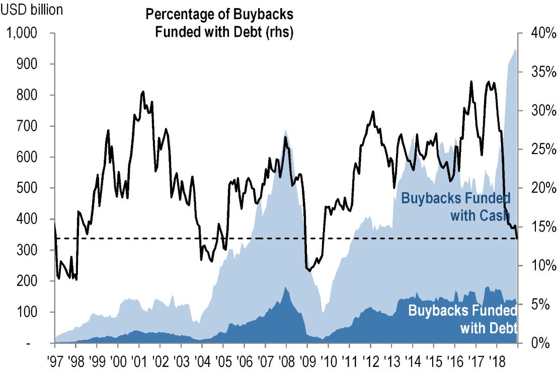Le carbutant de la hausse de la bourse ce sont les rachats d’actions par les entrepsies: on pense qu’ils vont à nouveau accélérer si la Fed abandonne bien sa tentative de normalisation. Les rachats d’actions sont financés par la dette et la dette est produite par la politique de la Fed.
