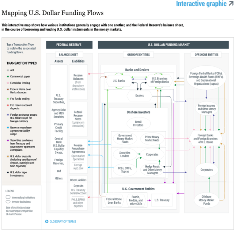 In this post, we answer these questions with the help of an interactive map that guides us through the web of interconnected relationships between the Fed, key market players, and the various instruments in the U.S. dollar funding market, highlighting the linkages across the short-term financial products that form this market.