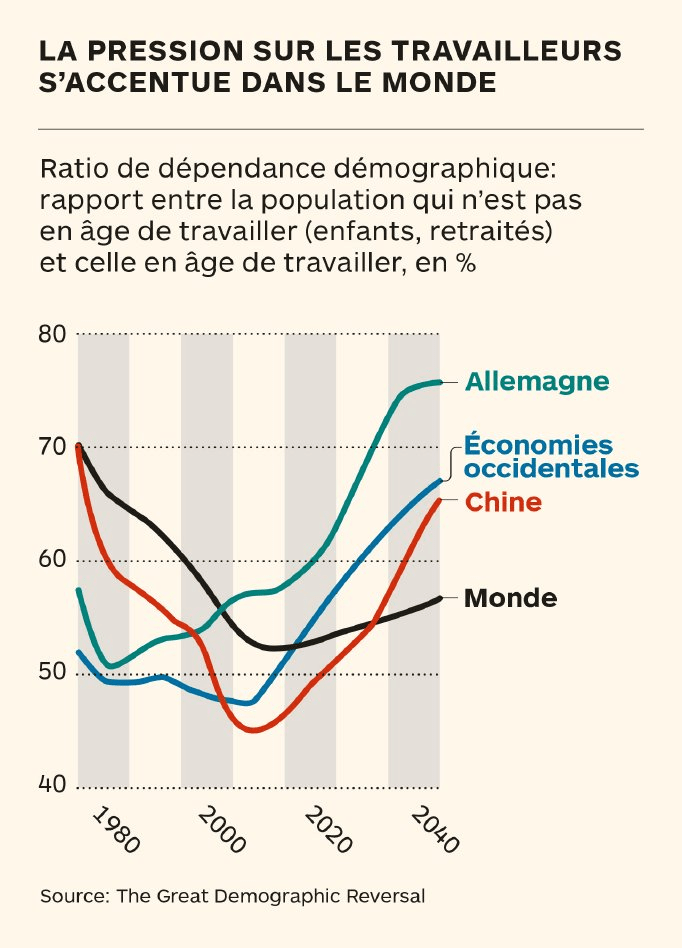 Le vieillissement de la population joue aussi un rôle. Le ratio de dépendance, c’est-à-dire le rapport entre la population qui n’est pas en âge de travailler (les enfants et les retraités) et celle en âge de travailler, joue un rôle crucial et devrait bientôt rapidement augmenter, en particulier en Chine et en Allemagne (voir infographie).
