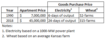 Les résultats de cet exercice sont présentés dans le tableau 2. (1) Notez à quel point l’appartement a plus de valeur en termes de production de blé ou d’électricité. En 1990, l’appartement valait la production de 52 fermes du Kansas. Vingt-huit ans plus tard, l’appartement – malgré quelques simples rénovations et quelques couches de peinture – valait la production de 315 fermes. En termes d’électricité, en 1990, l’appartement valait six jours de production d’une centrale électrique, mais en 2018, sa valeur avait grimpé en flèche à vingt-quatre jours de production. (2) La figure 1 capture tout cela.