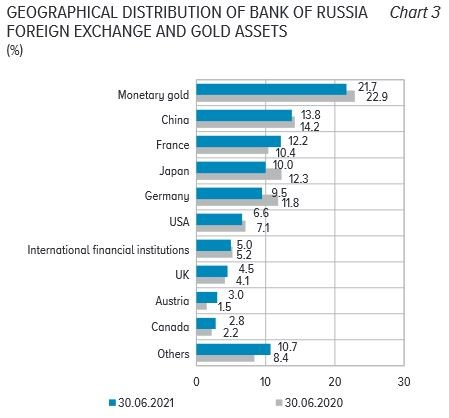 Le ministère des Finances ne détient plus d’actifs libellés en USD dans son fonds pétrolier et la CBR a également réduit de moitié la part de l’USD dans ses réserves, à environ 20 % ; car l’euro, et dans une moindre mesure le renminbi chinois, sont devenus des alternatives privilégiées.