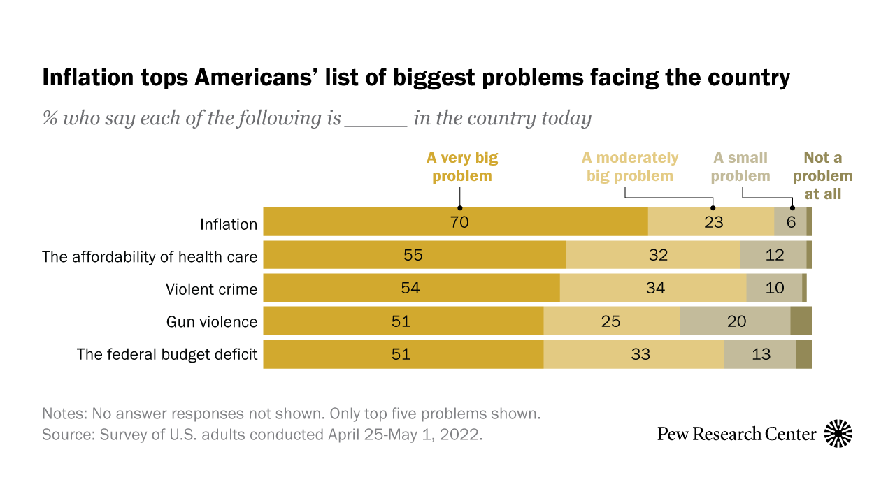Sept Américains sur dix considèrent l’inflation comme un très gros problème pour le pays aujourd’hui, suivi par la capacité à faire face aux soins de santé (55 %) et les crimes violents (54 %).