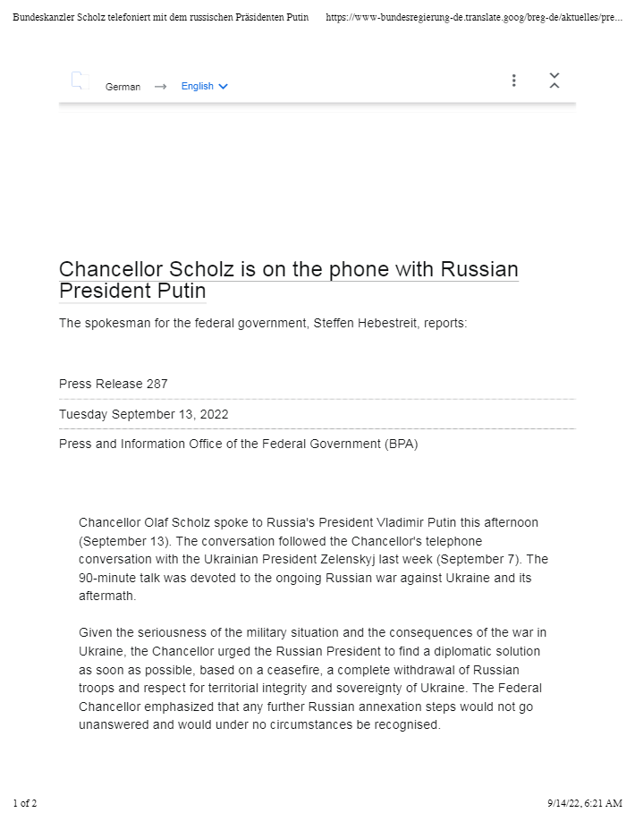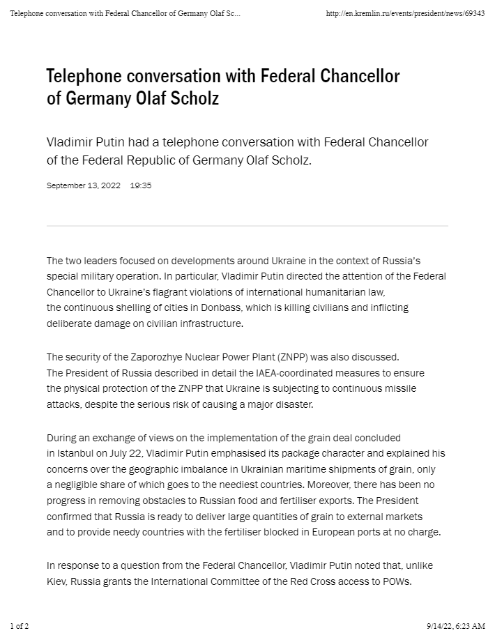 Le chancelier allemand Olaf Scholz et le président de la Fédération de Russie Vladimir Poutine ont eu un appel téléphonique de 90 minutes le 13 septembre.
