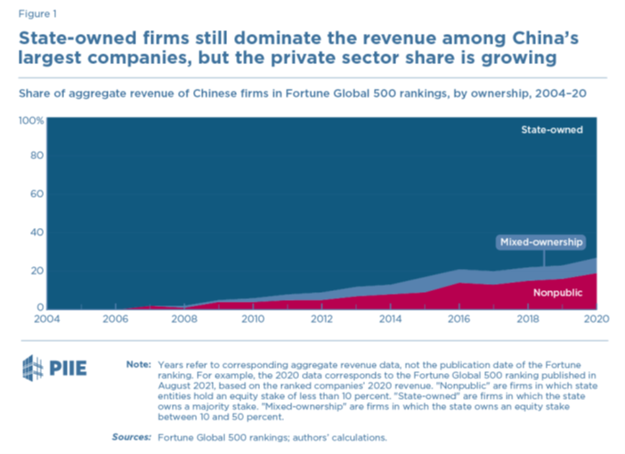 Le secteur capitaliste a augmenté sa taille et son influence en Chine, parallèlement au ralentissement de la croissance du PIB réel. Une étude récente a révélé que le secteur privé chinois a augmenté non seulement en termes absolus, mais aussi en proportion des plus grandes entreprises du pays, mesurées par les revenus ou (pour les sociétés cotées) par la valeur marchande, à partir d’un niveau très bas lorsque le président Xi a été confirmé. Mais les entreprises d’État dominent toujours parmi les plus grandes entreprises en termes de chiffre d’affaires, même si leur prééminence s’érode.