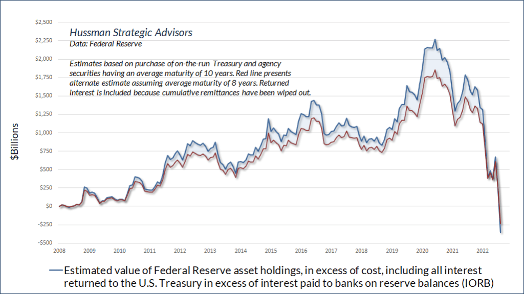Le graphique ci-dessus montre notre estimation de la valeur marchande des avoirs de la Réserve fédérale, en plus du coût.