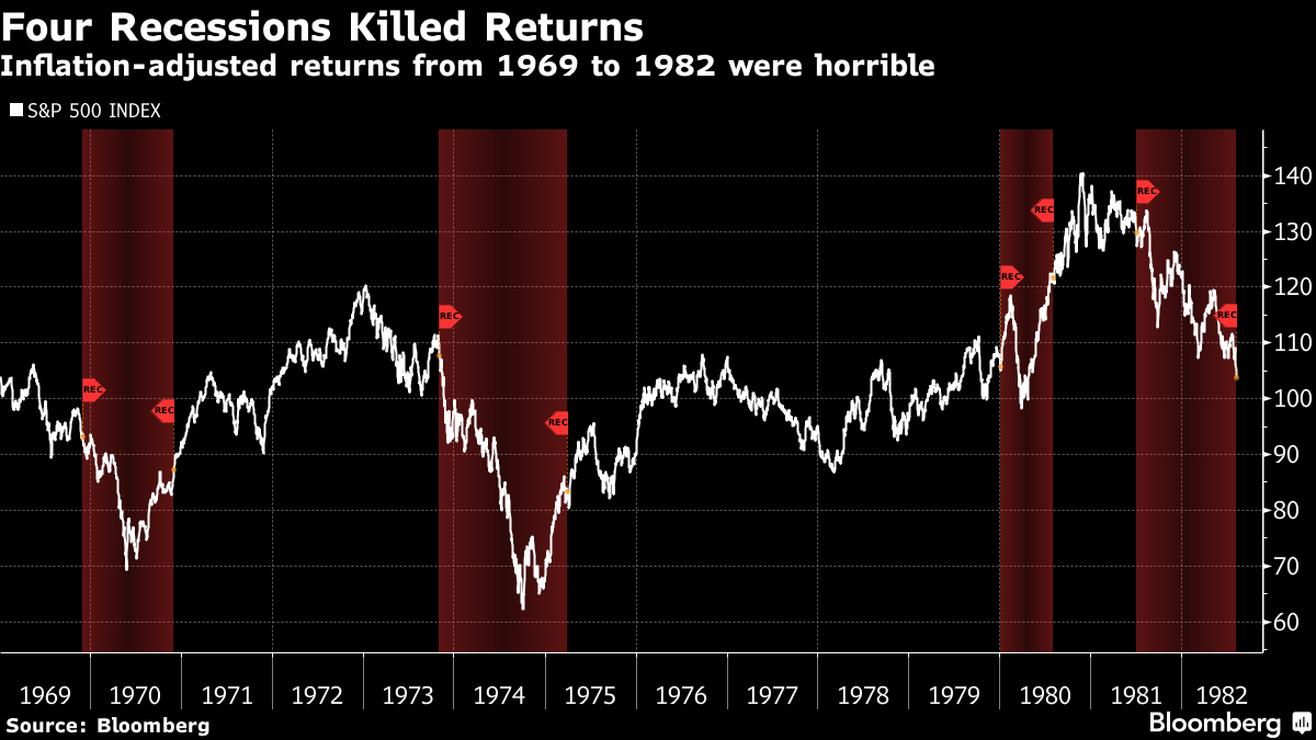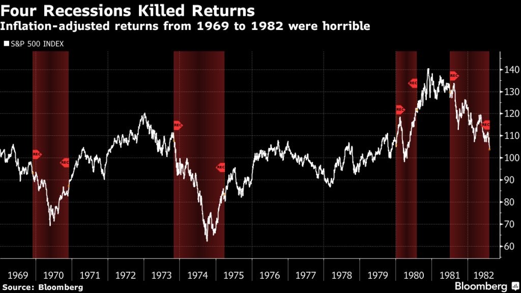 Les actions ont mal performé en termes corrigés de l’inflation sur une période plus longue de 1969 à 1980 simplement parce que nous avons eu trois récessions sur une période de 10 ans. Ajoutez à cela une quatrième récession en 1981 et 1982, avec un marché à peine plus élevé après une inflation à deux chiffres, et le tableau est encore pire.