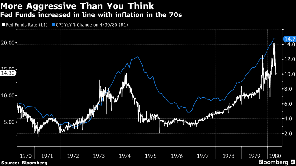 Dans le même temps, être trop timide ne signifie pas que la Fed va simplement se retourner. Par exemple, en mai, j’ai publié ce graphique montrant à quel point la Fed des années 1970 était agressive.