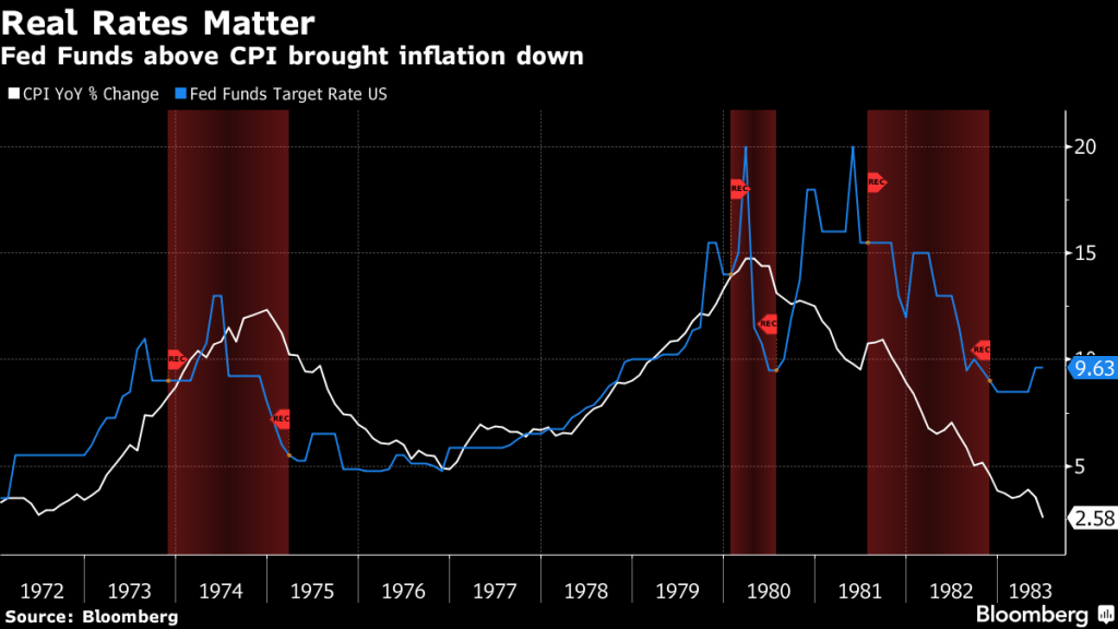 Alors que l’inflation augmentait au milieu des années 1970, la Fed a relevé les taux d’intérêt. Ce n’est que lorsque la Fed a voulu forcer les rendements réels – mesurés par le taux des fonds fédéraux par rapport à l’inflation des prix à la consommation – à passer profondément en territoire positif sous Paul Volcker que l’inflation a commencé à baisser.