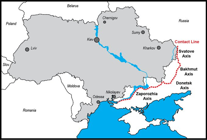 À l’heure actuelle, la ligne de contact est d’environ 700 kilomètres qui s’étendent de l’estuaire du Dniepr au sud jusqu’au nord de l’oblast de Lougansk. Les concentrations de troupes et les combats actifs sont largement présents sur quatre axes majeurs. (Cartes par moi).
