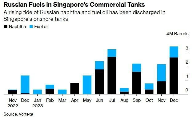 🔸C’est la tendance depuis octobre 2022, selon Bloomberg, et en décembre, les terminaux de Singapour ont reçu un volume de pétrole et de fioul russes deux fois plus important que l’année précédente.