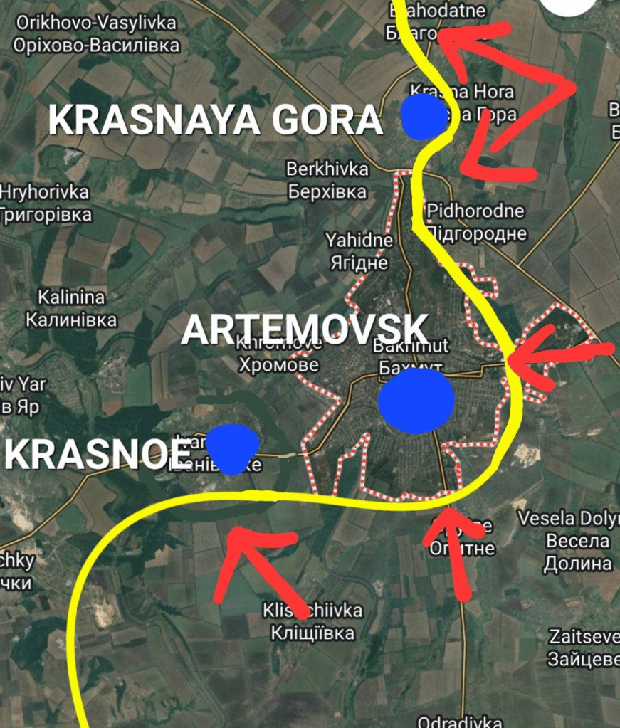 Mais le bastion d’Artemovsk, contrairement aux racontars pro-russes n’est pas encore tactiquement encerclé, même si ses dernières portes ouvertes sont déjà battues par les feux russes.