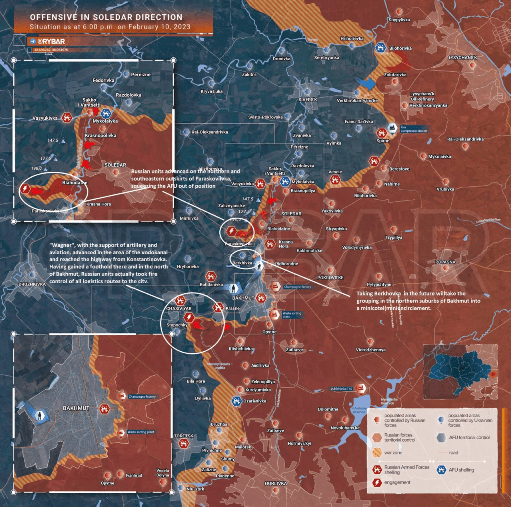 ◽️Au sud-ouest de Bakhmut, « Wagner », avec le soutien de l’artillerie et de l’aviation, a avancé dans la région du vodokanal et a atteint l’autoroute depuis Konstantinovka. Ayant pris pied là-bas et au nord de Bakhmut, les unités russes ont en fait pris le contrôle de toutes les routes logistiques menant à la ville.