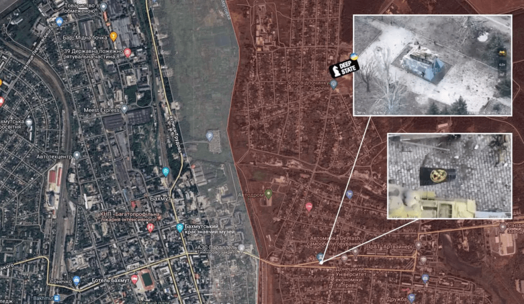 Apparemment, presque tout à l’est de la rivière Bakhmutovka (qui divise Bakhmut presque en deux) a maintenant été pris, comme le montre la carte ci-dessus. Et il existe d’autres preuves géolocalisées, comme tcette vidéo des forces de Wagner hissant le drapeau sur un point de repère connu près du centre-ville.